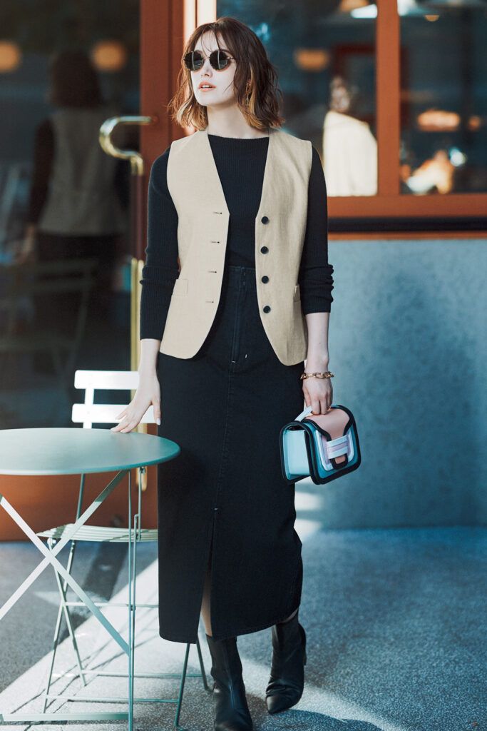 大好きだからこそ、マンネリしないよう新しい着こなしを模索したいモノトーン。この春はジレを重ねて気分を一新!ジレ※着回し ニット¥25,300(スローン/ザ ショップ スローン 新静岡セノバ店)デニムスカート¥28,600(ロンハーマン)バッグ¥165,000(ピエール アルディ/ピエール アルディ東京)ブーツ¥42,900(ダブルスタンダードクロージング/フィルム)サングラス¥44,000(アイヴァン/アイヴァン 東京ギャラリー)ピアス¥11,000ブレスレット¥12,100(ともにワンエーアールバイウノアエレ/ウノアエレジャパン)