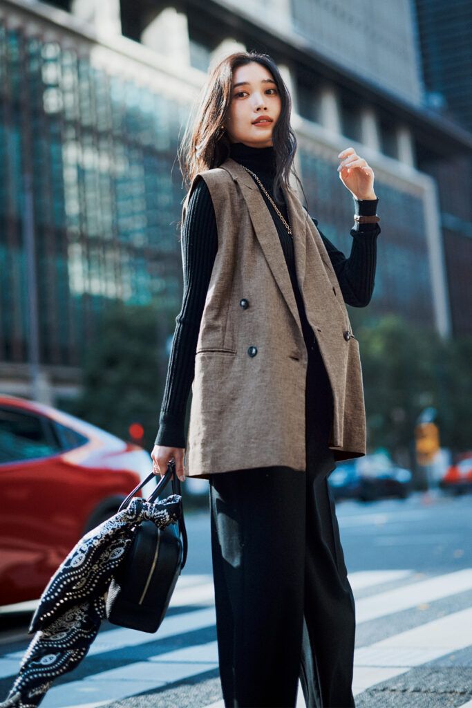 ジレを一枚羽織るだけで、着慣れたモノトーンもぐっと新鮮に