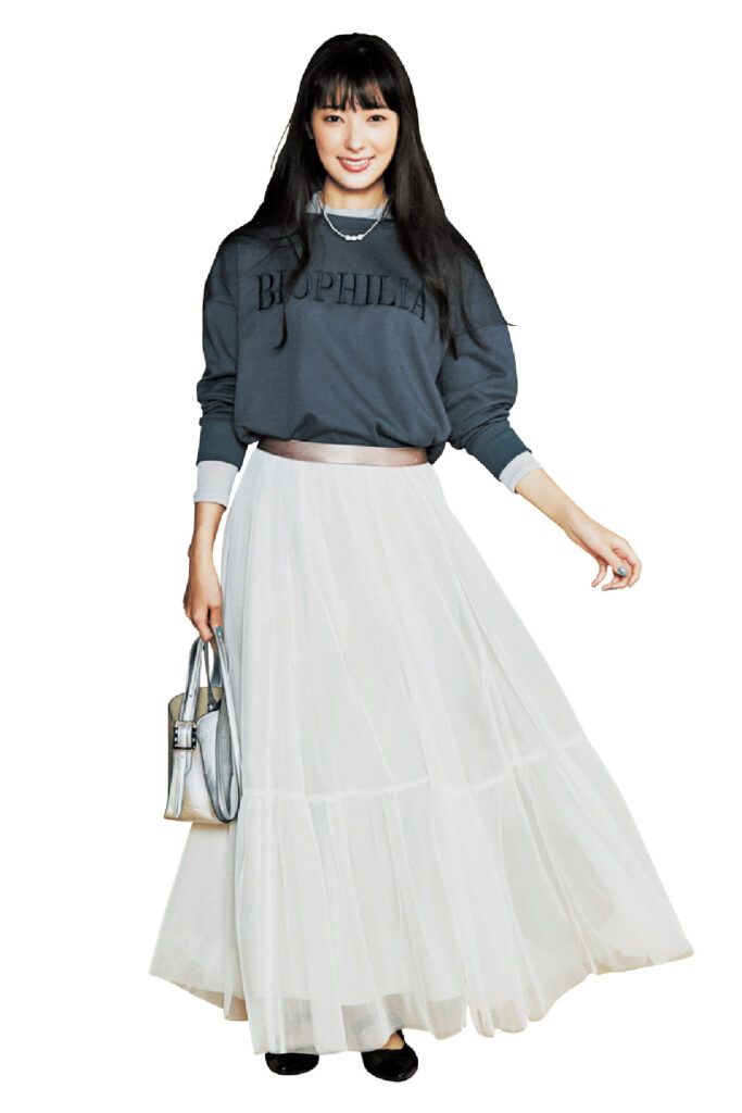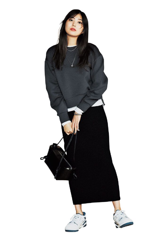 スウェットも下に着るカットソーも身幅が広すぎないことがポイント。どちらのアイテムも生地にほんのり光沢があってハリのあるものだと品よく、スッキリとキマります。スウェット¥5,990(アンフィーロ)カットソー¥11,550(スローン)スカート¥31,900(ソブ/フィルム)バッグ¥102,300(ヘリュー/ヘリュージャパンオフィシャルオンラインストア)スニーカー¥17,600(ニューバランス/ニューバランスジャパンお客様相談室)コインネックレス¥28,600ボールチェーンネックレス¥31,900 (ともにマリハ)ブレスレット¥6,480(アビステ)