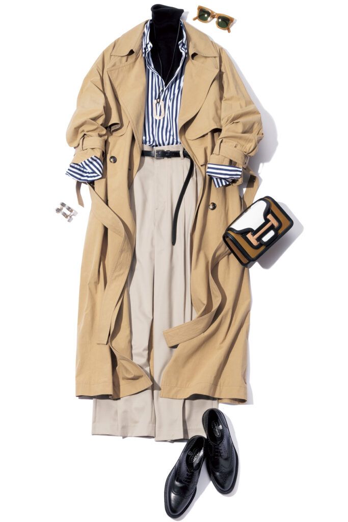 メンズライクなベーシックはストイックすぎるので、ストライプを挟んでアクセントに。ボーダー感覚で合わせられて、無地のシャツより華やかさが出せるストライプは春に使いたくなるアイテム。たらしたベルトが定番服を「普通」で終わらせない一役に。トレンチコート¥91,300ベルト¥14,300(ともにサクラ/インターリブ)シャツ¥39,600(ユニオンランチ/サザビーリーグ)ノースリーブニット¥26,400(スローン/ザ ショップ スローン 新静岡セノバ店)パンツ¥30,800(ブリル/ブリル新宿)バッグ¥143,000(ピエール アルディ/ピエール アルディ 東京)シューズ¥128,700(ジェイエムウエストン/ジェイエムウエストン 青山店)サングラス¥46,200(モスコット/モスコット トウキョウ)ネックレス¥29,700バングル¥52,800(ともにアダワットトゥアレグ)