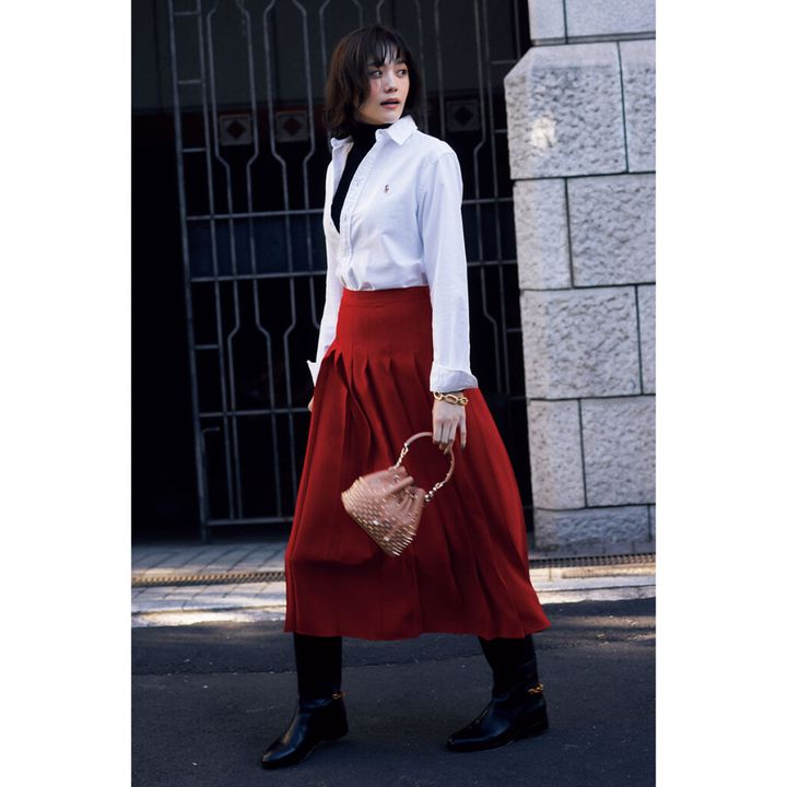 ベースはあくまでトラッドながら、エレガントで上品なエッセンスを帯びた上級者スタイリング。赤のスカートに白シャツ一枚ではちょっぴり唐突だけど、黒を挟むことで知性を感じる大人の着こなしに。パーフェクトなレイヤードを作っておけば、緻密に計算したかのようなバランスが簡単に実現するから頼もしい!ニット¥26,400(スローン/ザ ショップ スローン 新静岡セノバ店)シャツ¥22,000(ポロ ラルフ ローレン/ラルフ ローレン)スカート¥64,900(ポロ ラルフ ローレン/ラルフ ローレン)バッグ¥258,500ロングブーツ¥227,700(ともにJIMMY CHOO)ブレスレット¥14,300(ワンエーアールバイウノアエレ/ウノアエレ ジャパン)