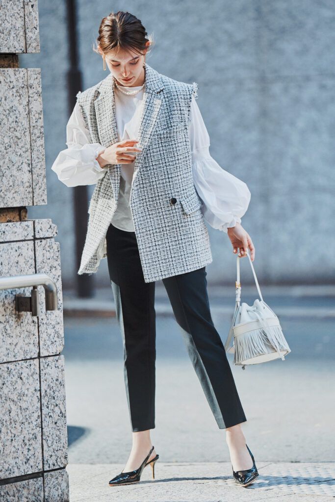 ツイードにボリューム袖ブラウスで上半身を盛った分、ボトムスはシンプルな黒のスティックパンツを。小物もモノトーンで統一して引き算して、オフィカジでも甘いアイテムを楽しみたい。ジレ※着回し ブラウス¥26,400(マルティニーク/マルティニーク ルミネ横浜)パンツ¥9,990(PLST)バッグ¥148,500(J&M デヴィッドソン/J&M デヴィッドソン カスタマーセンター)パンプス¥35,200(ピッピシック/ベイジュ)ピアス¥11,000(ワンエーアールバイウノアエレ/ウノアエレ ジャパン)ネックレス¥10,780(エイチアッシュ/フォーティーン ショールーム)