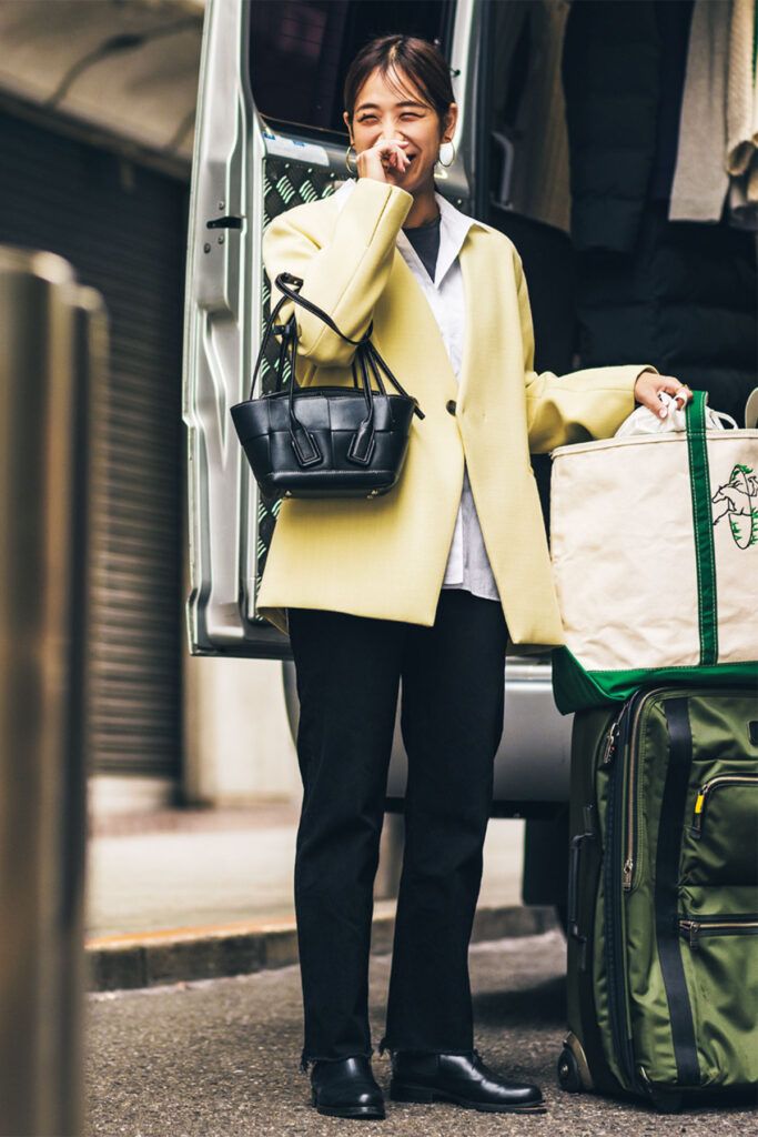 ジャケットは身幅が広いものをセレクトして。ジャケット¥23,100(カデュネ/カデュネ プレスルーム)シャツ¥23,100(マイカ アンド ディール/マイカ ア ンド ディール 恵比寿店)パンツ¥22,000(セテンス)バッグ¥40,700(FEEL AND TASTE /ショールーム セッション)スニーカー¥12,980(ニューバランス/ニューバランスジャパン お客様相談室)めがね¥52,800(アイヴァン/アイヴァン 東京ギャラリー)ピアス¥20,020(バルブス/ZUTTOHOLIC)バングル¥19,800(イン ムード/フォーティーン ショールーム)