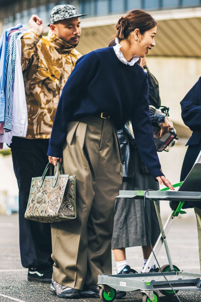 辛口ベイカーパンツとメンズ配色で、特別感×デイリー感のバランスを