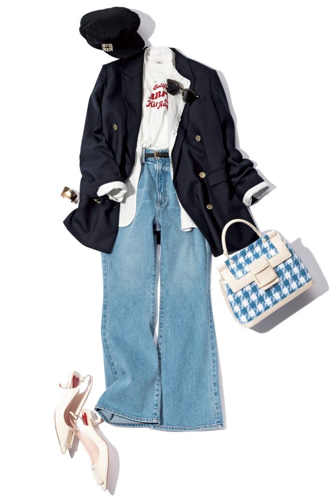 紺ブレはバサッと着られる大きめシルエットを選んで、トレンド感を意識。ロゴT一枚よりリネンシャツを重ねることで、雰囲気のある着こなしに。レイヤードした上半身にはボリュームが出るので、脚長効果の高いフレアデニムを選んですっきり見せます。ジャケット¥80,300(ebure/ebure GINZA SIX 店)シャツ¥25,300(ティッカ)Tシャツ¥14,300(ロンハーマン)デニムパンツ¥16,500(ニードバイヘリテージ/ゲストリスト)ベルト¥9,900(レフィエ/フラッパーズ)帽子¥97,900バッグ¥498,300パンプス¥124,300(すべてロジェ ヴィヴィエ/ロジェ・ヴィヴィエ・ジャパン)サングラス¥53,900(アイヴァン 7285/アイヴァン 7285トウキョウ)バングル¥11,550(エイチアッシュ/フォーティーン ショールーム)