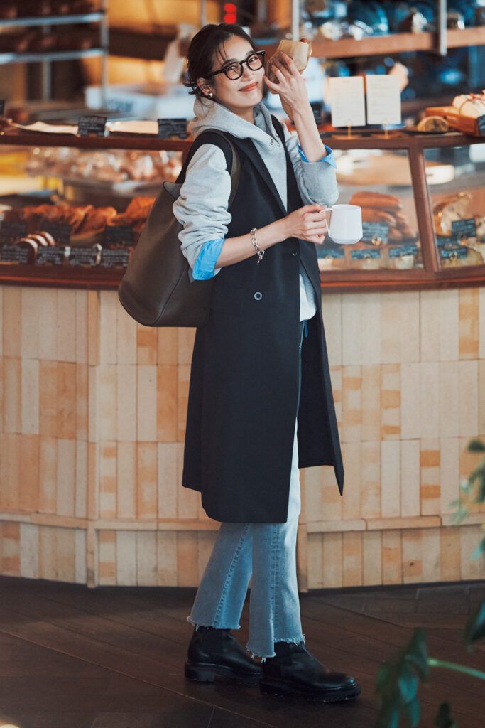 休日にたくさん着たいフーディ。そのままだとカジュアルすぎる時は、ジレを重ねて大人っぽく。ジレ※着回し フーディ¥39,600(RHC/RHC ロンハーマン)シャツ¥36,300(イレーヴ)デニムパンツ¥39,600(マザー/サザビーリーグ)バッグ¥169,400(J&M デヴィッドソン/J&M デヴィッドソン カスタマーセンタ ー)ブーツ¥68,200(ピッピシック/ベイジュ)メガネ¥40,700(アイヴァン/アイヴァン 東京ギャラリー)イヤリング¥7,560(アビステ)ブレスレット¥9,350(イン ムード/フォーティーン ショールーム)