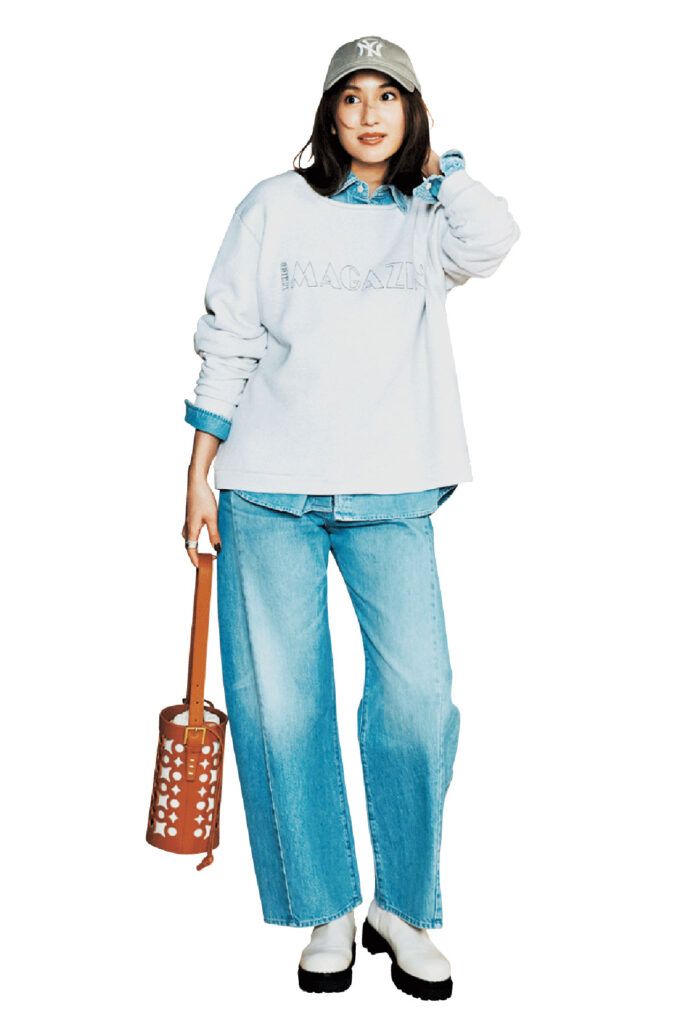肌がドライな印象なので、ハリのある生地や光沢が目立つ生地のものより、どこか古着っぽい感じのものがよく似合います。デニムシャツと浅いグレーのスウェットはそれぞれが肌の雰囲気と馴染むアイテムです。スウェット¥25,300(THIRD MAGA ZINE)シャツ¥29,800(レミ レリーフ/ユナイト ナイン)デニム〈3月発売予定〉¥47,300(マザー/サザビーリーグ)バッグ ¥57,200(ア ヴァケーション)ブーツ¥27,500(ダイアナ/ダイアナ 銀座本店)キャップ¥4,400(ニューエラ)ピアス¥6,480 アビステ)リング¥17,160(バルブス/ZUTTOHOLIC)