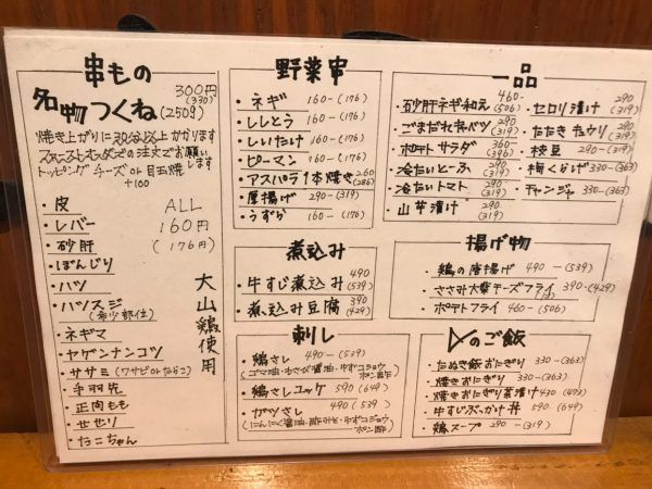 名物のつくねの他に、皮・レバー・砂肝・ぼんじり・ハツ・ハツスギ・ネギマ・ヤゲンナンコツ・ササミ・せせり・たこちゃん等があり焼鳥の種類も豊富でした!!タレ・塩から選ぶことができます。大山鶏・備長炭を使用しているとのことです。