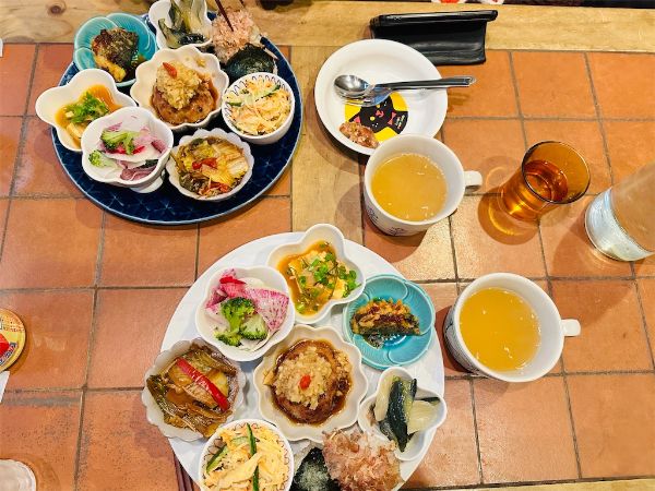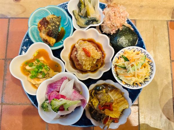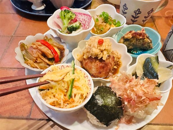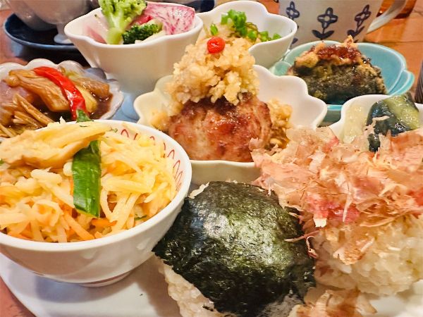 こちらが「おむすび菜っぱプレート」。プレートにおむすびやおかずなど9種類がのっています。見た目が鮮やかで美しく、野菜を使った料理が豊富で体に良さそう☆
