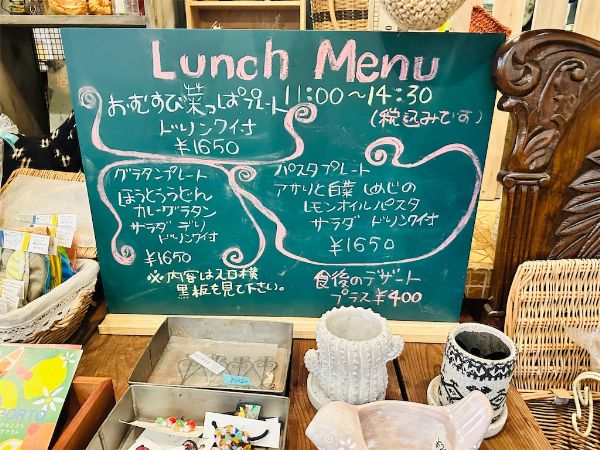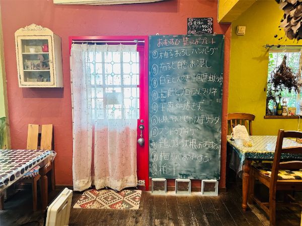 「おむすび菜っぱプレート」をオーダーしました。入口横にある黒板に内容が書かれています。あまりの多さに驚きました!