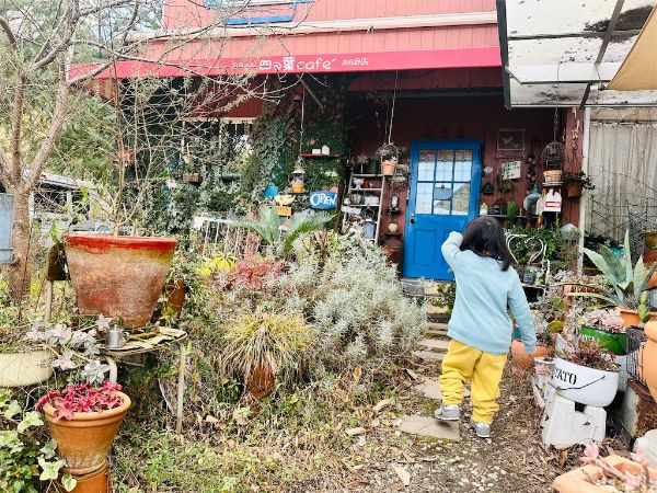 植物がいっぱいで、青いドアが印象的なかわいい外観。入る前からワクワクします。