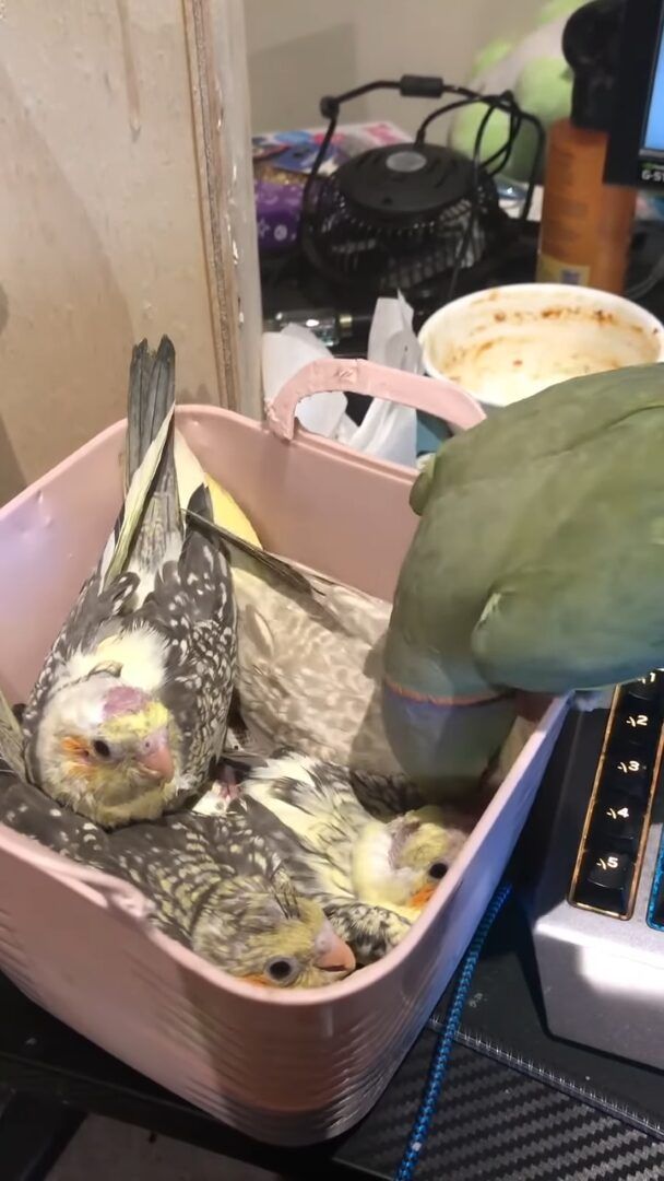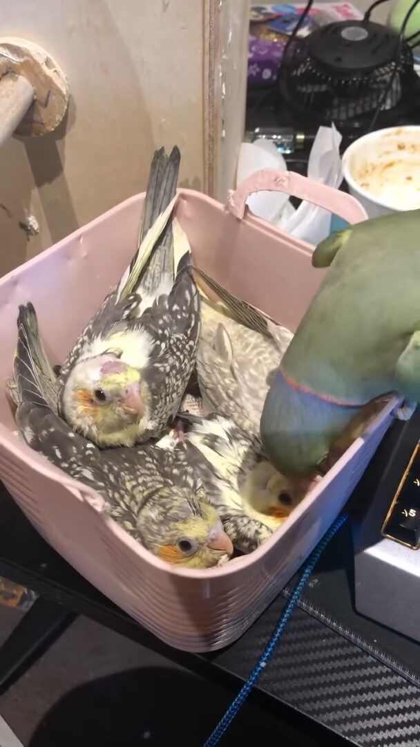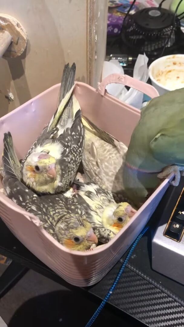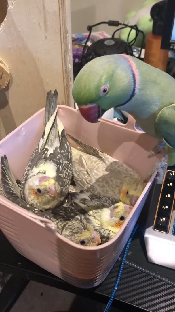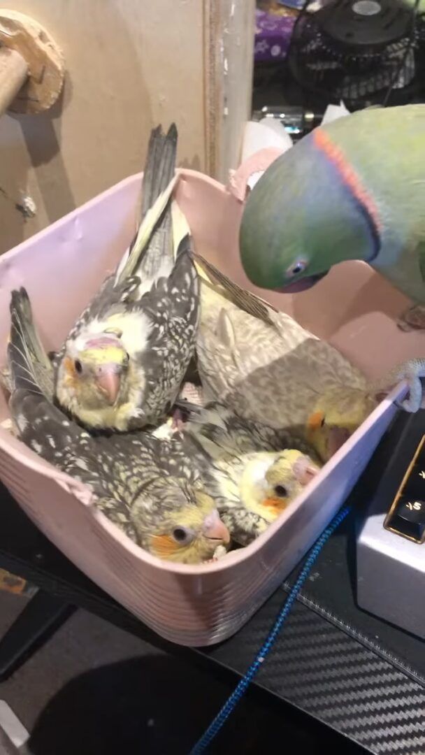 幼い鳥たちを一時的に自宅で保護することになった撮影者さん。 すると、この家で暮らす先輩インコが後輩たちを歓迎するかのような行動に出ました!