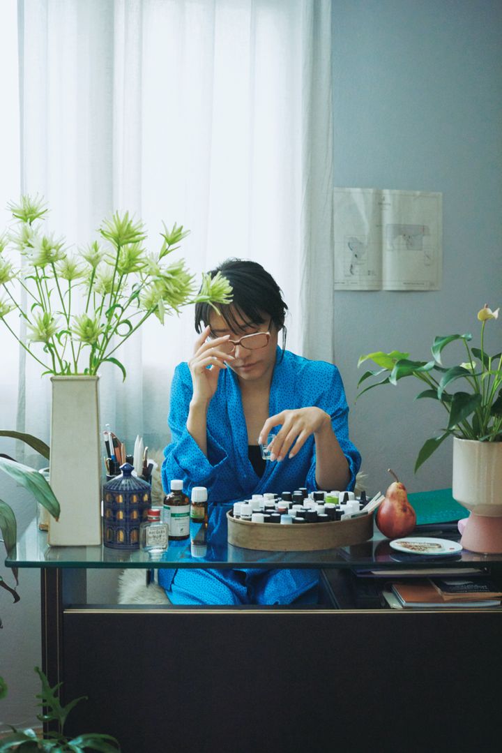 「お風呂には基本、毎晩入ります。一日のいろいろを流して緩ませる時間だから、成分だけでなく香りもすごく大事にしています。タラソテラピーとフィトテラピーの考えに基づくデトックス入浴剤は上がるとからだも心もすっきり。ガルバナムの樹脂、苔、パチュリをベースにした深い香りも、吉野ヒノキから抽出した天然精油の瑞々しさも好き。香りは邪気も払うのよ。香りなしなら羊水塩。約10カ月に渡る長い期間、母の胎内の羊水という海の中で過ごして生まれる私たち。その羊水を再現したというミネラル調整塩、羊水塩は箱買いで常備。いわゆる一般の塩とは異なり、人体液と同様の成分・濃度を持っているため、用法によってさまざまな効果が。入浴に使うと体内の過剰電気や不要物等を排出し、必要なミネラルを吸収しやすくなるそう」。たくさんのお気に入りの中から厳選した4点を。