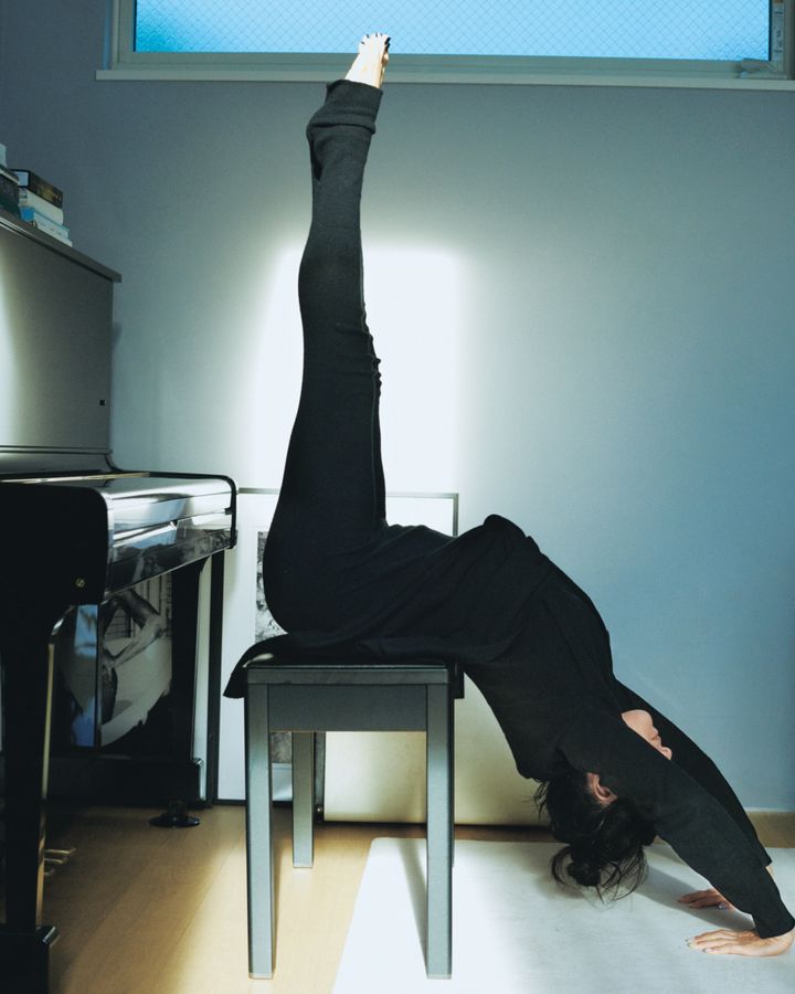 「1日ひと逆立ち。週一度のヨガをしていますが、運動量としてはなかなか不足しているので、内臓が下垂して働きが鈍くなるのも防ぎ、正しい位置に戻すイメージをしながら血流促進、逆立ち呼吸。ヘッドスタンド、腕力を鍛えるためにハンドスタンドも。ちなみにこのポーズは撮影用(笑)」