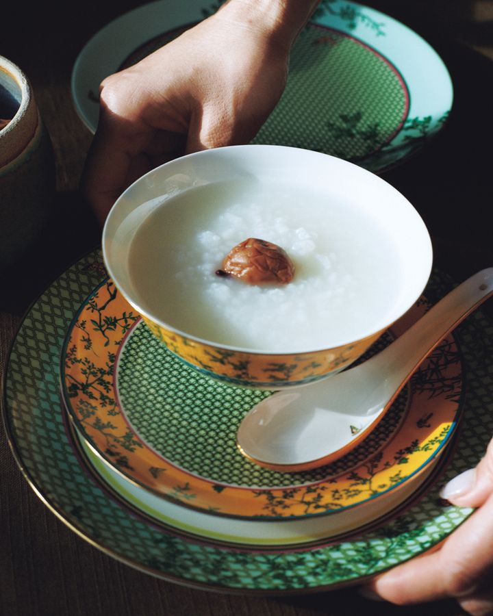 「朝粥は胃腸を温め、負担をかけずに消化吸収をおこないエネルギーを補える。優しさしかない朝ごはん(笑)。中医学理論において、朝ごはんは土(胃)の時間である7~9時に摂るといいとされています。お粥だからと飲み込まないでしっかり噛んでいただきます」