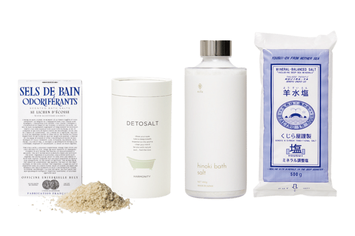 右から:羊水塩 500g ¥400(泉州塩業 鯨屋)、hinoki bath salt 400g ¥4,290(発酵温浴nifu)、デトソルトreset body 850g ¥10,000(ハーモニティ)、バスソルト セル・ドゥ・バン・オドリフェラン リケン・デコスの香り 500g ¥4,510(オフィシーヌ・ユニヴェルセル・ビュリー/ビュリー ジャパン)