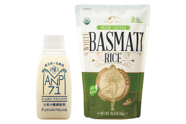 右から:シェフズチョイス有機バスマティライス1kg/本人私物、お米の醗酵飲料 ANP71 150g ¥324※参考小売価格(福光屋)