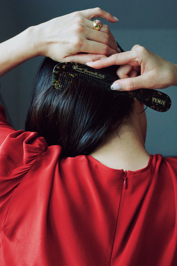 この連載でも以前8ページにわたり香りについて語ったことのあるゆみえさんが、愛してやまない香水のひとつが、ギリシャ神話で最も美しいエロスとプシュケの純愛物語にオマージュを捧げて生まれたディプティックのフルール ドゥ ポー。「フランス語で肌に咲く花という素敵な名前も、しっとりと密かに甘く温かく漂うところも本当に好み。つい先日、ヘアフレグランスがあるのを知って歓喜! 丁寧に髪を整えた後、出かける前に最後にふわっと潜らせて」