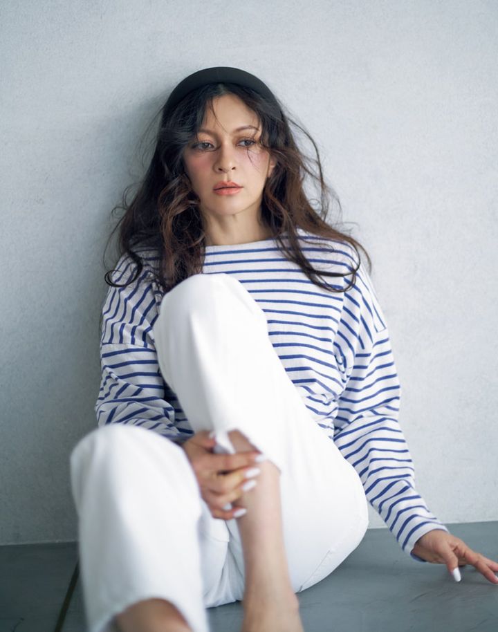 ボーダーカットソー¥20,900(シー/エスストア)、デニムパンツ¥15,400(リーバイス®/ジャーナル スタンダード レリューム ルミネ新宿店)、カチューシャ¥27,500(ソフィー ブハイ/エスケーパーズオンライン)