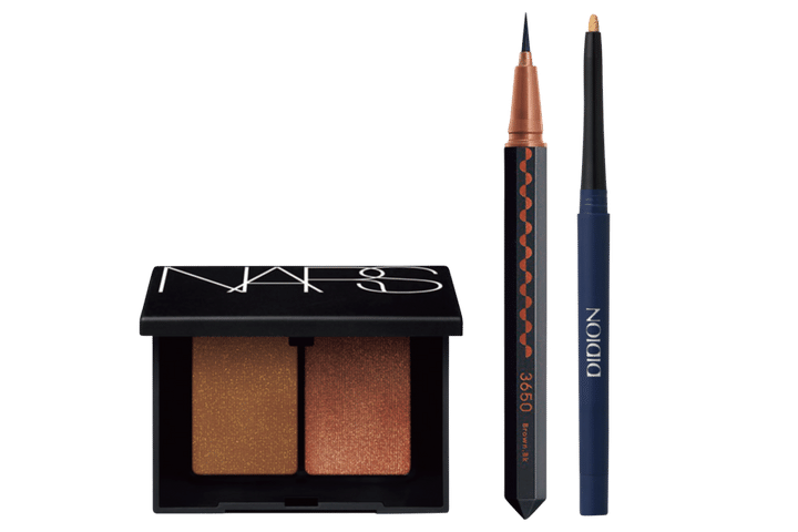左から:ナーズ デュオアイシャドー 3919 ¥4,620(NARS JAPAN)、3650 リキッドアイライナー ブラウンブラック ¥1,650(D-Nee コスメティック)、DIDION スムース カラーアイライナー 07 Golden Hour ¥1,540(ファッションネット)