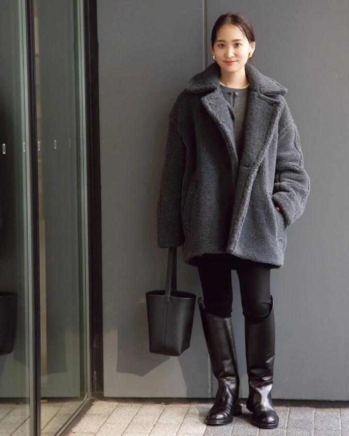 「今季ハマっているグレーを主役にスタイリング。ニットのアンサンブルがブランドの定番ですが、そこにチラッと見えるくらい、さり気ないインナーを差し込むのが今っぽくて◎。小柄なのでビッグショルダーのコートにはタイトなボトムを合わせて、シャープなバランスを意識しました」