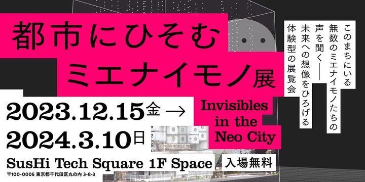 ■都市にひそむミエナイモノ展 Invisibles in the Neo City会期:2023年12月15日(金)〜2024年3月10日(日)会場:SusHi Tech Square 1F Space(東京都千代田区丸の内3-8-3)開場時間:【火~金】11:00~21:00(最終入場20:30)【土・休日】10:00~19:00(最終入場18:30)休業日:月曜アクセス:JR山手線・京浜東北線「有楽町駅」より徒歩1分東京メトロ有楽町線「有楽町駅」D9番出口よりすぐ東京メトロ有楽町線「銀座一丁目駅」より徒歩3分