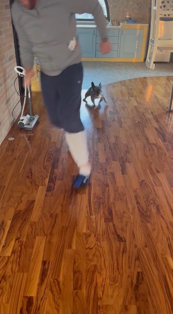 ツルツル滑るフローリングの床もなんのその!ブルドッグが飼い主さんと全力でおいかけっこ中!!【海外・動画】