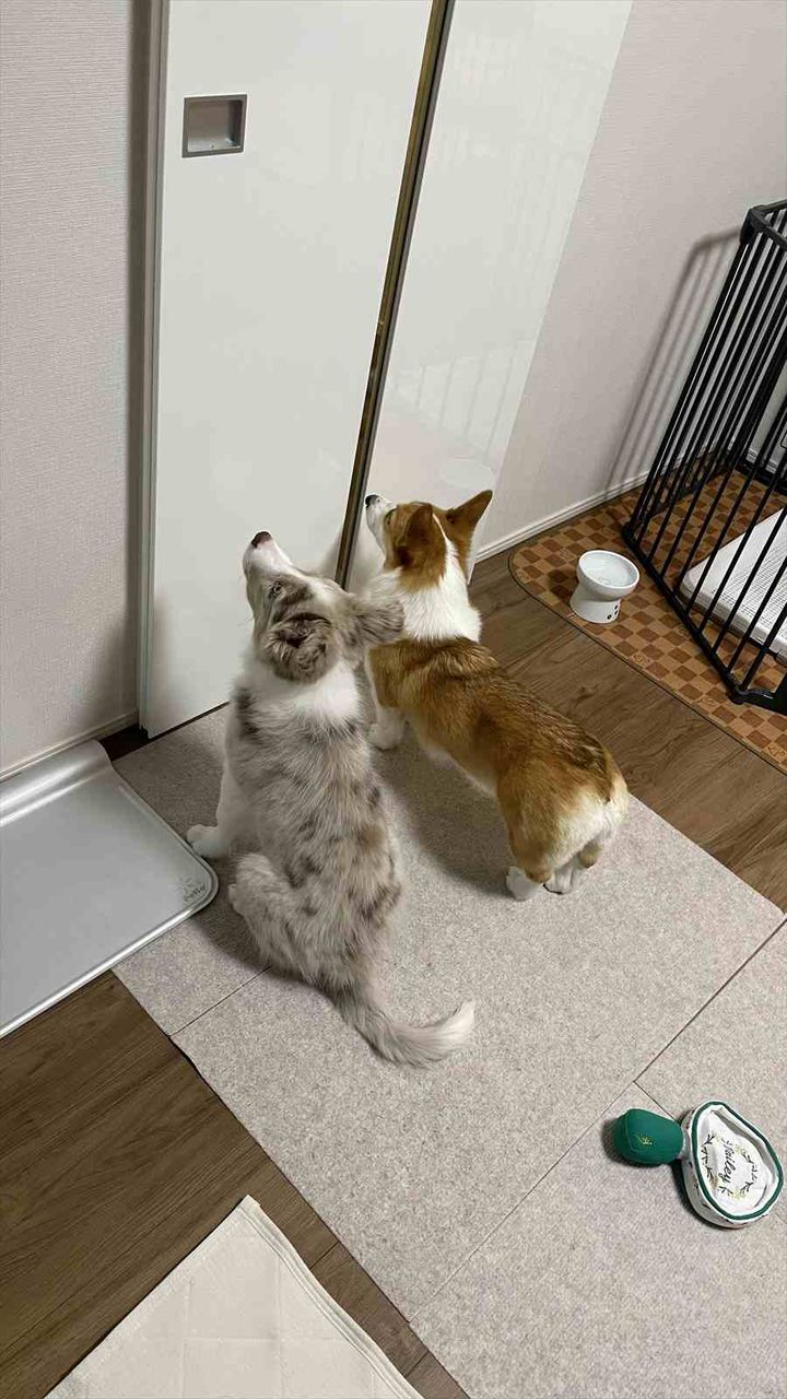 ご紹介するのは、もなか・ラグナ(@corgimona0907)さんがXに投稿された写真です。 愛犬のコーギー『もなか』ちゃんとボーダーコリーの『ラグナ』くんが、ママさんの帰宅を待っている時の様子がこちら。