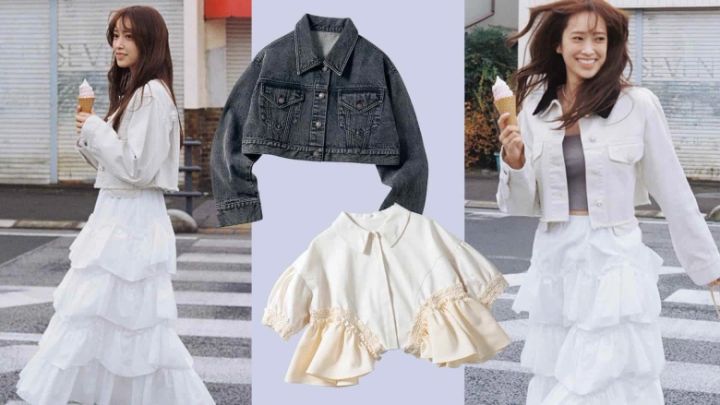 今季は短め丈がトレンドのデニムジャケット。コンパクトになってもカジュアル度は高めだから、中のコーデはこってり甘めがちょうどいい。
