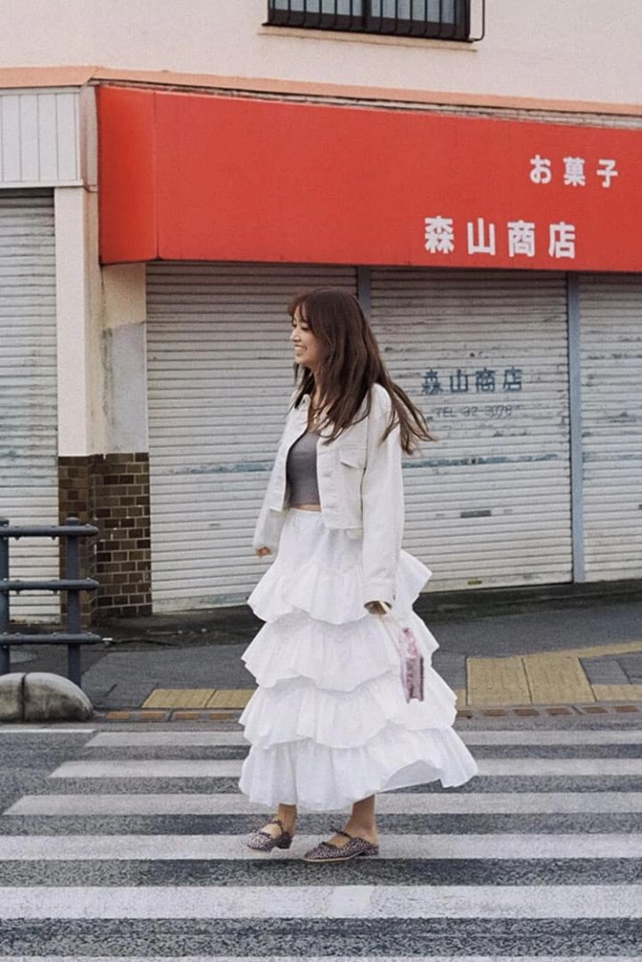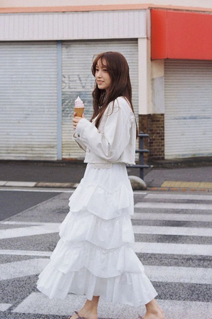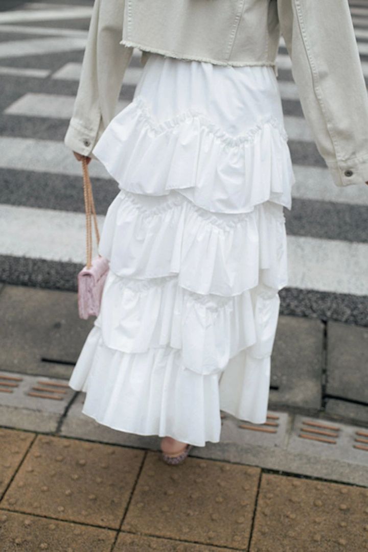 上はきゅっと、下はふわっとのメリハリでスタイルアップ!たっぷりフリルのスカートの甘さを白でつなげてなじませるのがポイント。