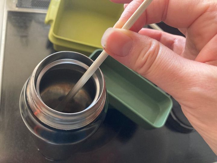 それは、お弁当作りに使った菜箸のうち1本をひっくりかえし、後ろの部分で深めのポットや水筒の中身をかき混ぜること。