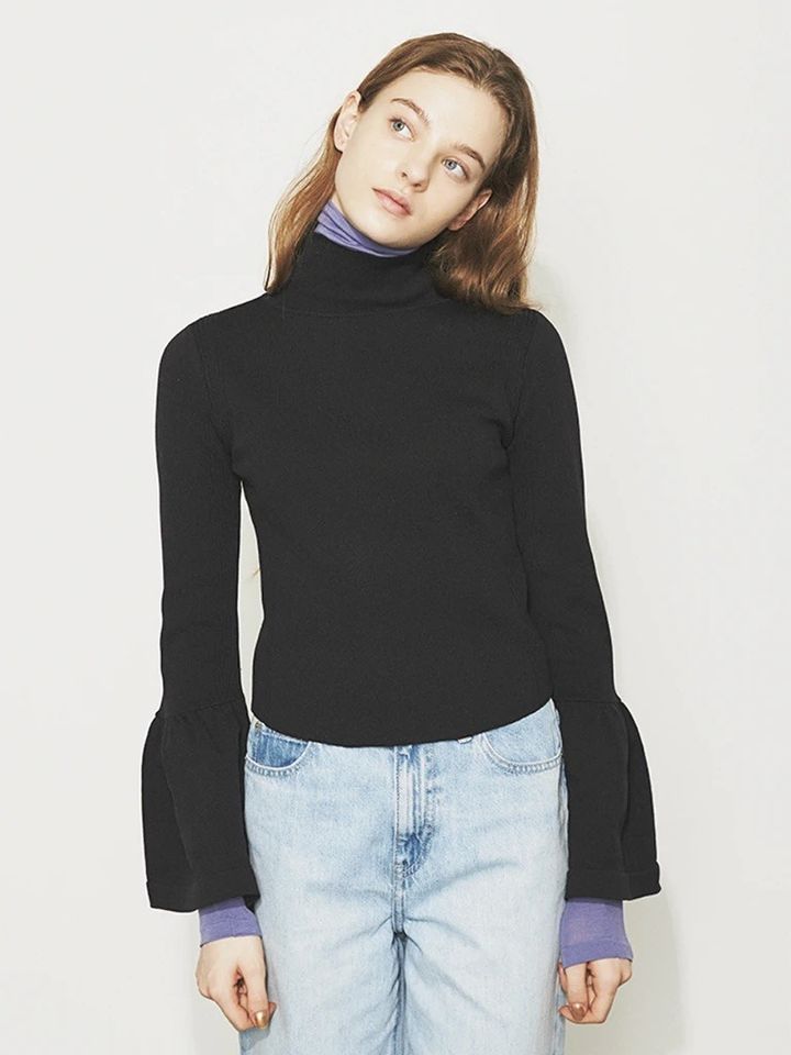ベルスリーブ黒ニット 8,690円/ココ ディール パープルタートルネックカットソー 1,290円/UNIQLO 黒に相性のいいパープルがアクセント。今季注目の透ける素材も、ニットトップスやカーディガンのインナーとしてなら使いやすい。
