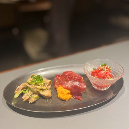 前菜のヤムニョムチキンのようにちょっぴり辛い薬念和牛ポテトサラダ(真ん中)、