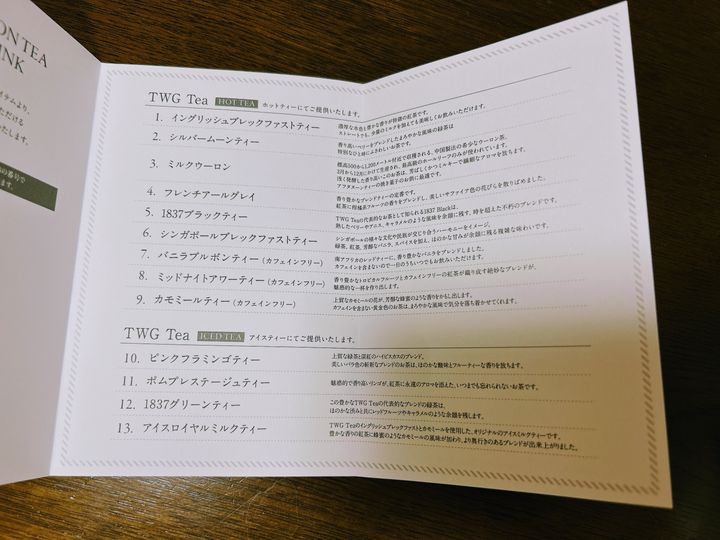 コーヒーやカフェラテも選べますが、TWGのお茶がなんと13種類も選び放題なんです!