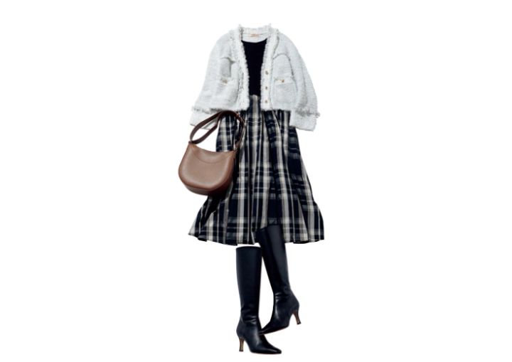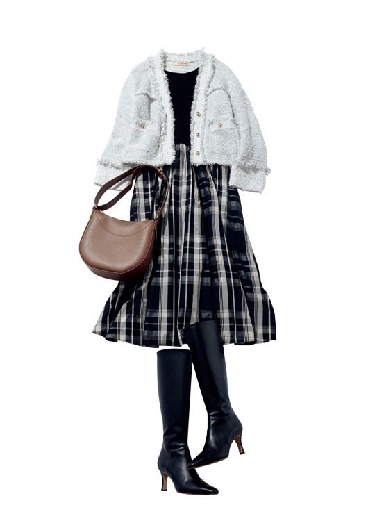 ドッキングワンピース¥23,100、ツイードカーディガン¥24,200/ともにアプワイザー・リッシェ、ショルダーバッグ¥2,990/UNIQLO、ロングブーツ¥44,000/ダイアナ(ダイアナ 銀座本店)