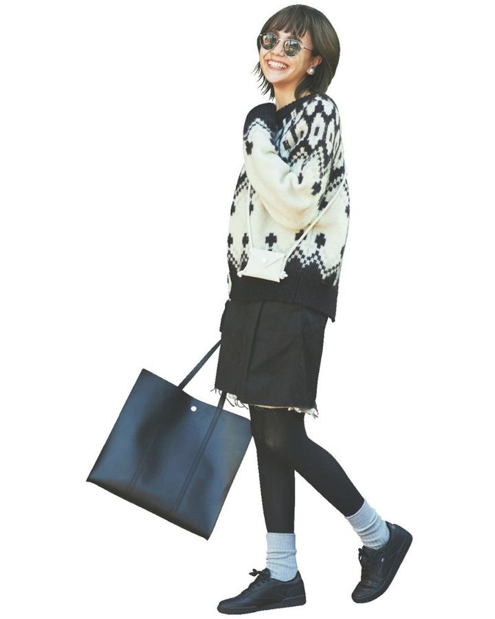 リブソックス¥3,080(ザシンゾーン/シンゾーン ルミネ新宿店)スニーカー¥11,000(Reebok)ニット¥21,560(FRAY I.D/FRAY I.D ルミネ新宿2店)ミニスカート¥31,900(ブリル/ブリル新宿)リブタイツ¥1,540(靴下屋/タビオ)ミニショルダーバッグ¥11,000トートバッグ¥17,600(ともにジ アート オブ キャリング/TTIME)サングラス¥47,410(オリバーピープルズ/ルックスオティカジャパン カスタマーサービス)パールイヤリング¥12,960(アビステ)