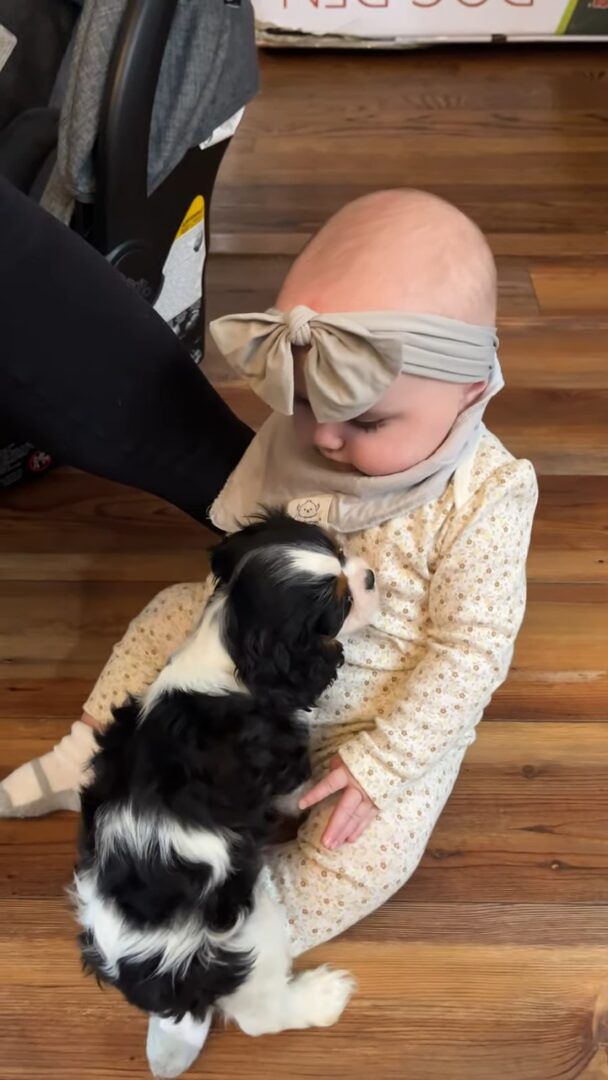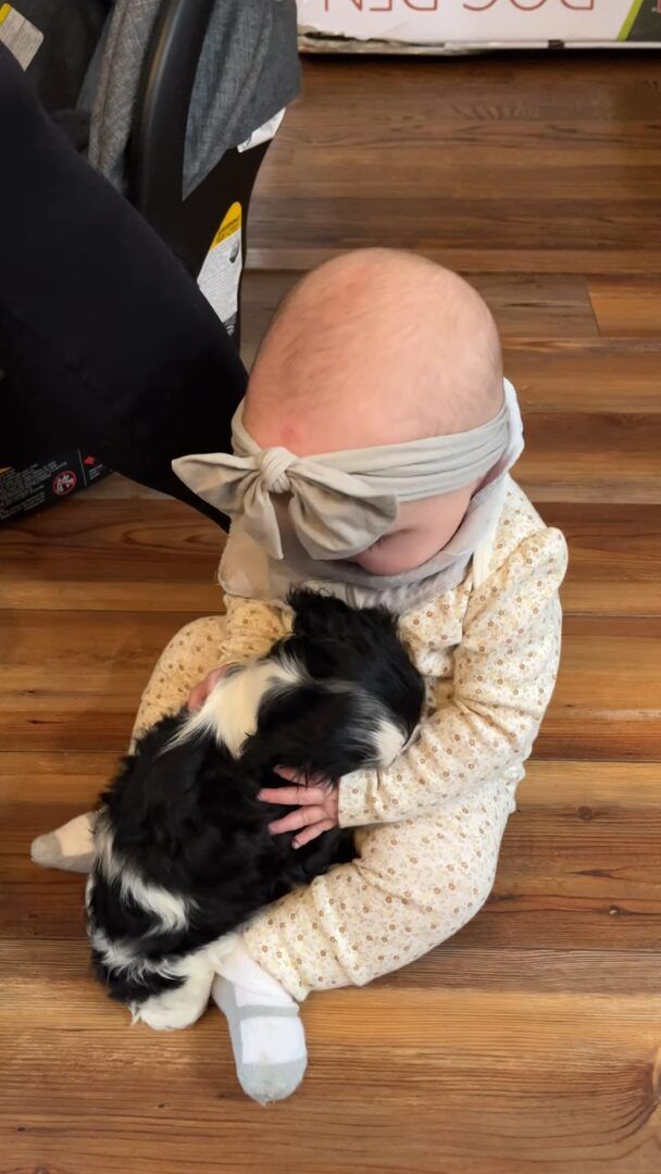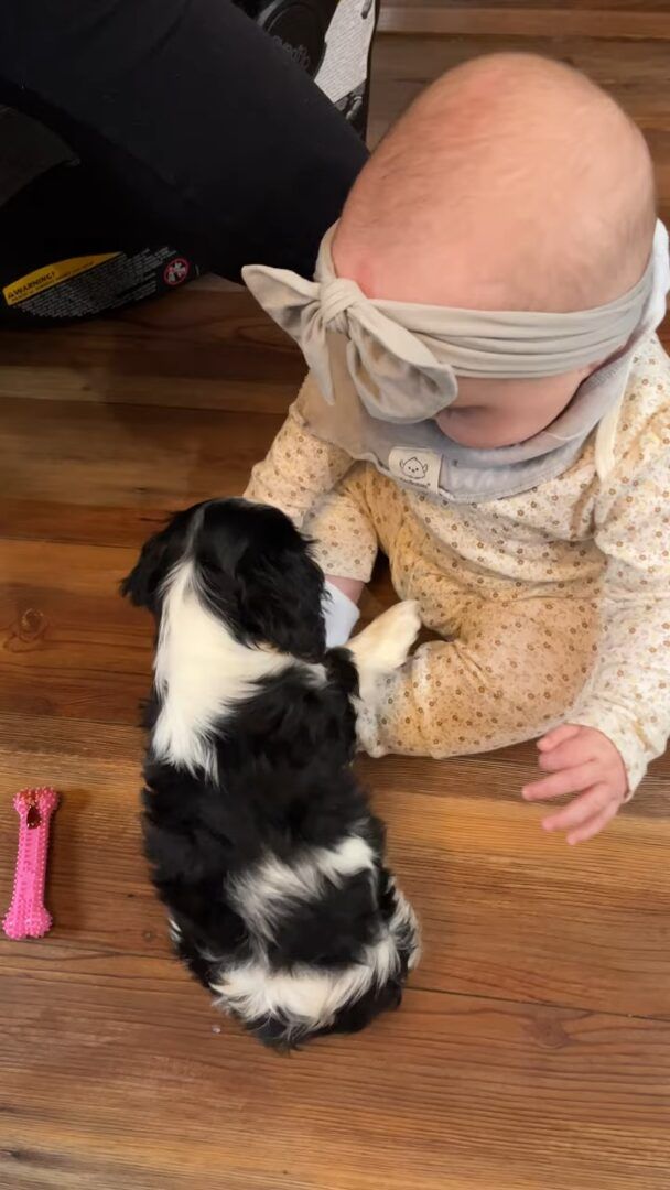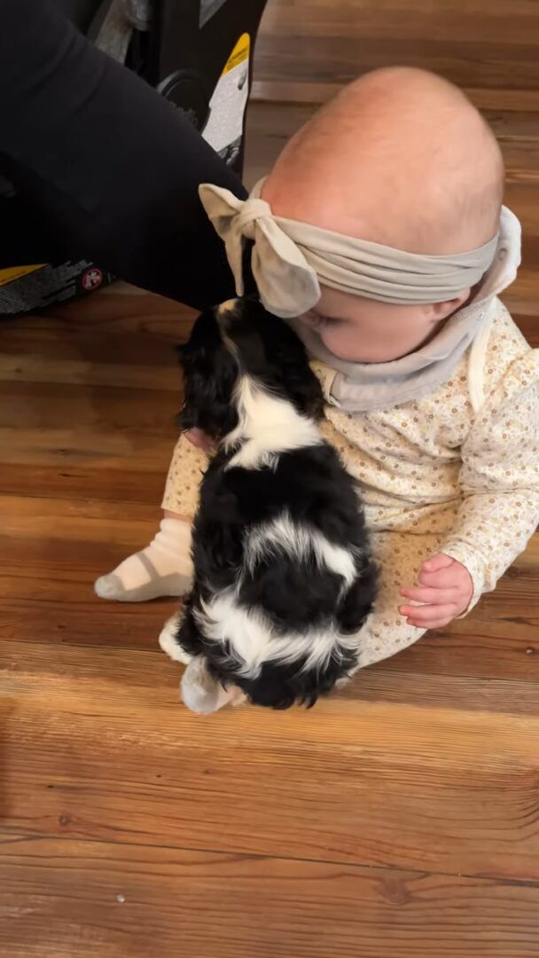 初めて顔を合わせた、生後6ヶ月の赤ちゃんと生後9週の子犬。 幼いふたりは互いに惹かれ合うものがあったようで、すぐにお友達になりました!!