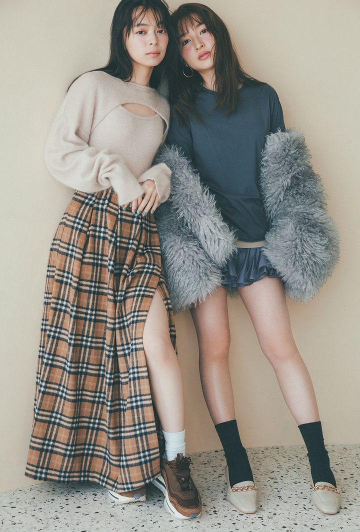 [星来]アウター¥33,000/シールームリン カットソー¥7,590/ココ ディール 中に着たインナー¥1,500/ユニクロ ショートパンツ¥13,970/スナイデル ローファー¥10,120/ラウナレア(ウフ) ピアス¥4,180/アネモネ(サンポークリエイト) ソックス/スタイリスト私物 [萌衣]ニット(タンクトップとセット)¥13,200/ココ ディール スカート¥9,790/アクレント スニーカー¥23,430/ナイキ スポーツウェア(ナイキカスタマーサービス) ソックス/スタイリスト私物