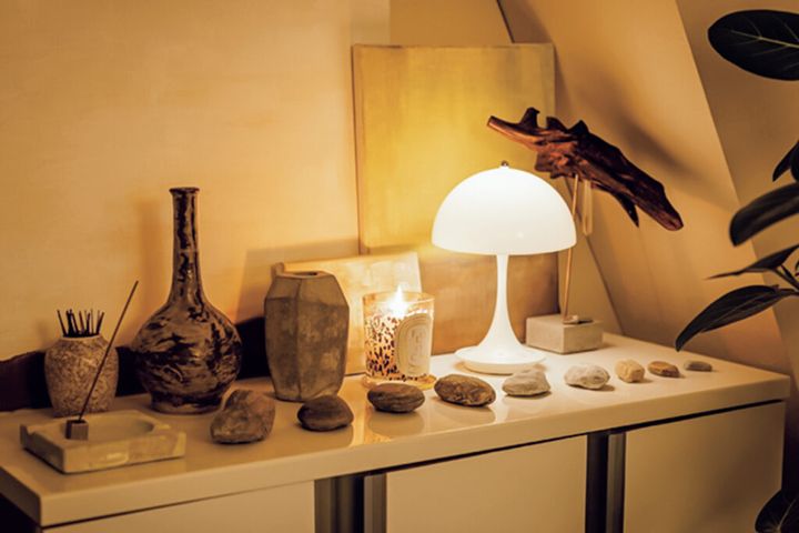 ルイスポールセンのテーブルライトに照らされた石は、「旅先などでふと目に留まると持ち帰ってしまう」というコレクションアイテム。金本さんが描いたキャンバス画は、実は壁面にあるブレーカーの目隠しにもなっている。