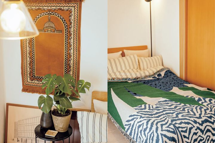 寝室の壁に掛けているラグは古着屋さんで購入。ベッドに掛けたブランケットはL.A.を拠点とするブランド「Slowdown Studio」のもの。