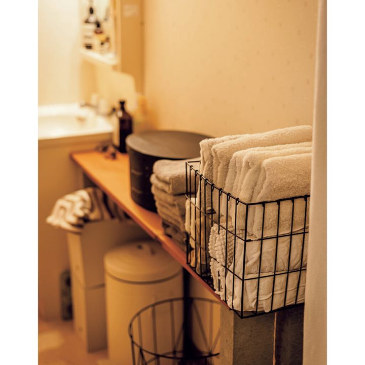洗面スペースにはブロックを重ねて天板を渡した自作の棚を。化粧品は黒のシェーカーボックスに、タオル類はワイヤーバスケットに収納している。