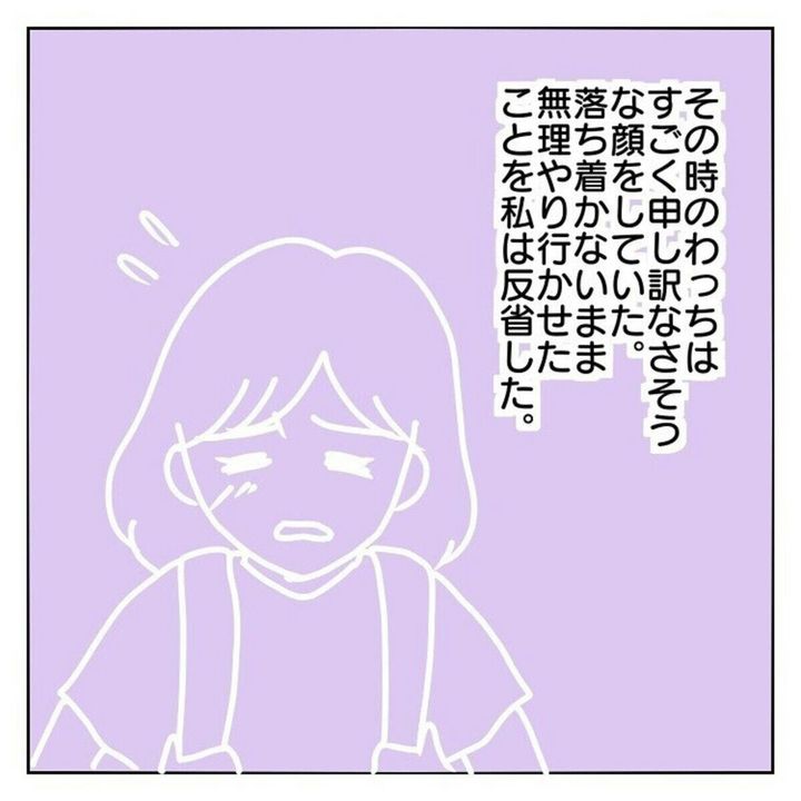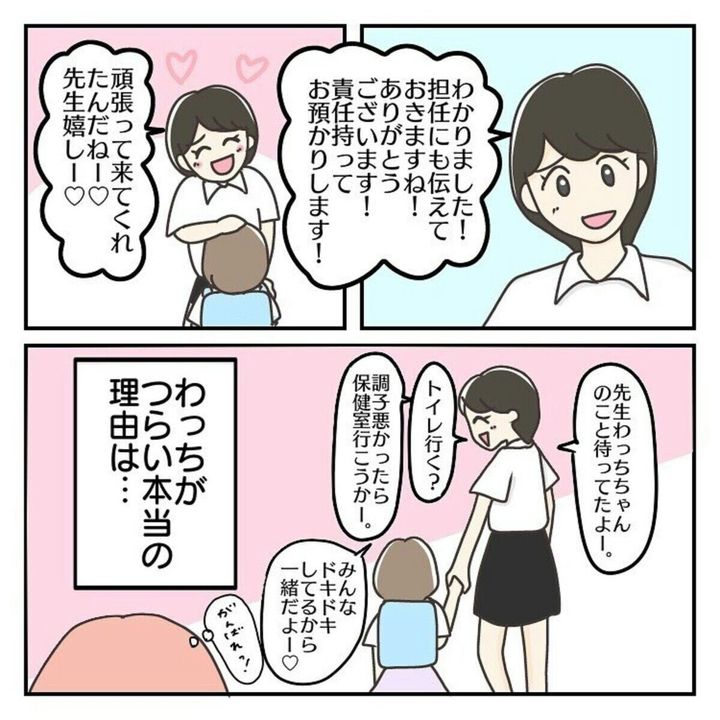 泣いているわっちちゃんを見て「昨日自分がせかしてしまったせいだ」と感じたねこじまいもみさん。今日はせかさず、集合登校の時間に遅れることを伝えたうえで自分が一緒に登校しようと決めていました。少しすると腹痛は落ち着いたように見えたわっちちゃん。ねこじまいもみさんは仕事があったため、学校に一緒に行き、調子が悪かったら先生に言うように伝えます。