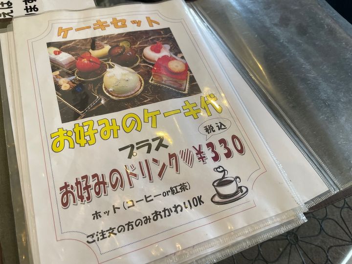 店内でケーキをいただく場合にはコーヒーか紅茶のみ330円で、おかわりもできる形でした。(3月以前の状態) カップが小さめで飲みやすく、この日は同伴者が2杯いただいていました。