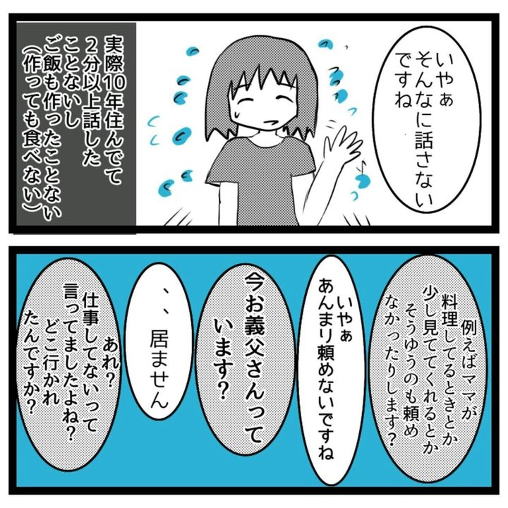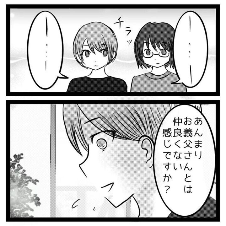 日ごろ、ほとんど交流のない義父に次男を預けるのが心配だったゆーとぴあさん。児童相談所の職員から「義父とはあまり仲良くないのですか?」とストレートな質問をぶつけられます。