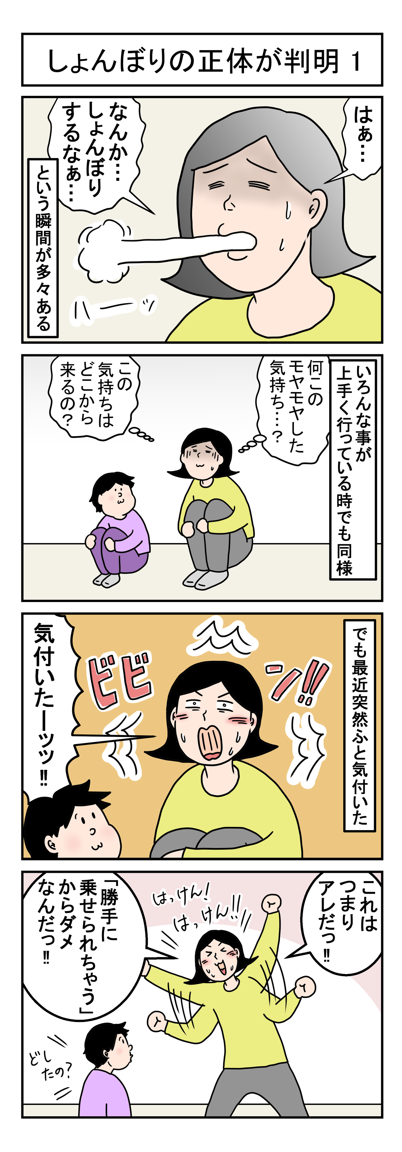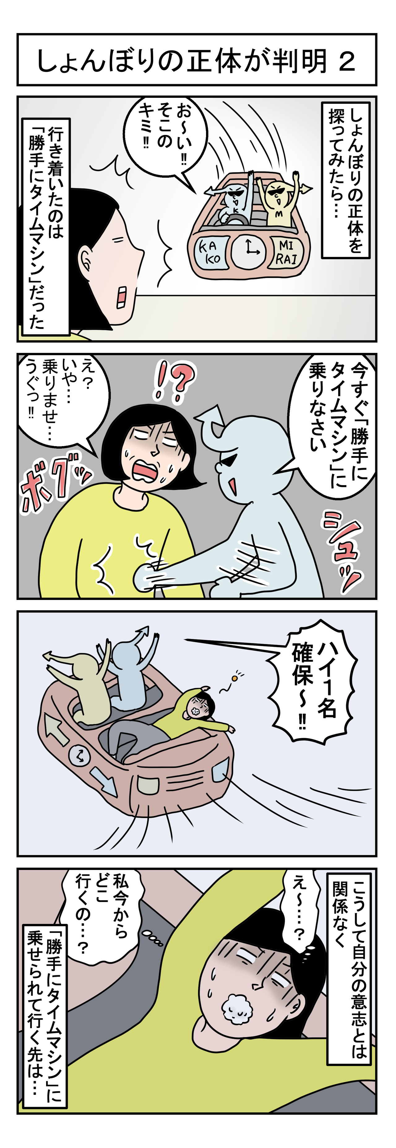 モヤモヤの原因は「『勝手に乗せられちゃう』からダメなんだっ!!」と気付いたワンタケさん。しょんぼりを探ってみると、何と「勝手にタイムマシン」である事が判明します。タイムマシンから降りてきた人にワンタケさんの意思とは関係なく乗せられて行ってしまうのだそう。その度にワンタケさんは嫌な気分になるそうです。