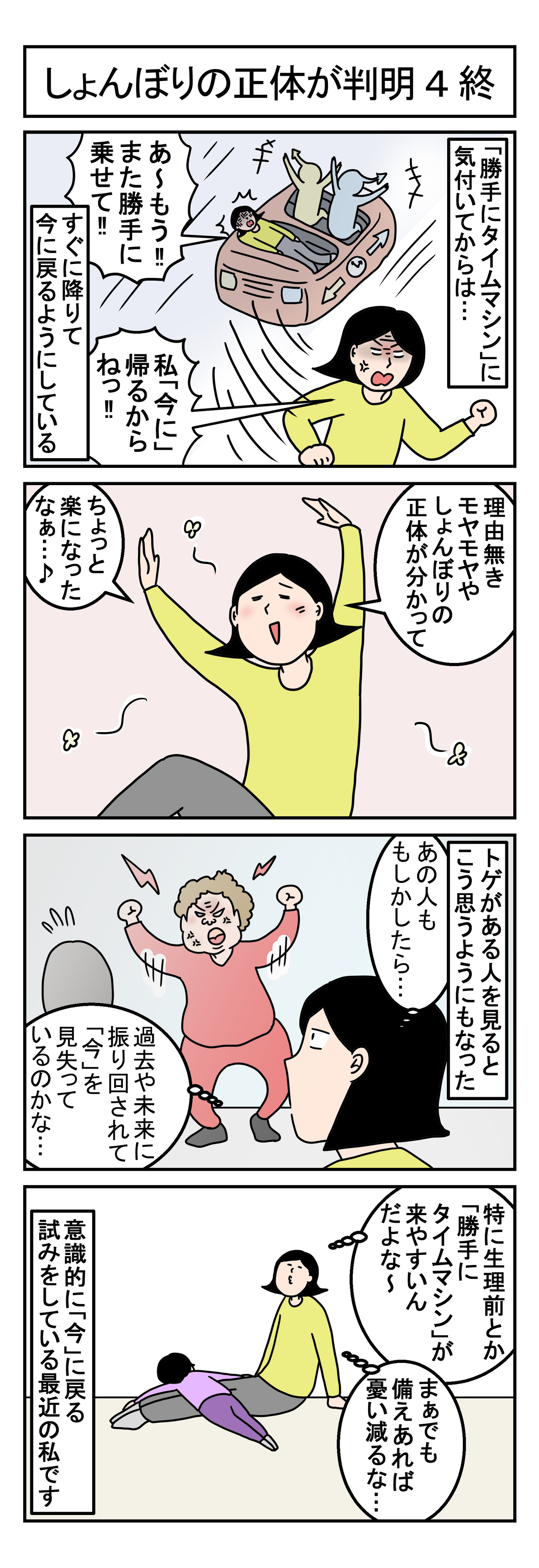 理由が無いモヤモヤや、しょんぼりの正体が分かり、ワンタケさんはとても楽になったのだそう。それからというもの、トゲがある人を見ると、過去や未来に振り回されて「今」を見失っているのかな…と思い、意識的に「今」に戻る試みをしているワンタケさんなのでした。