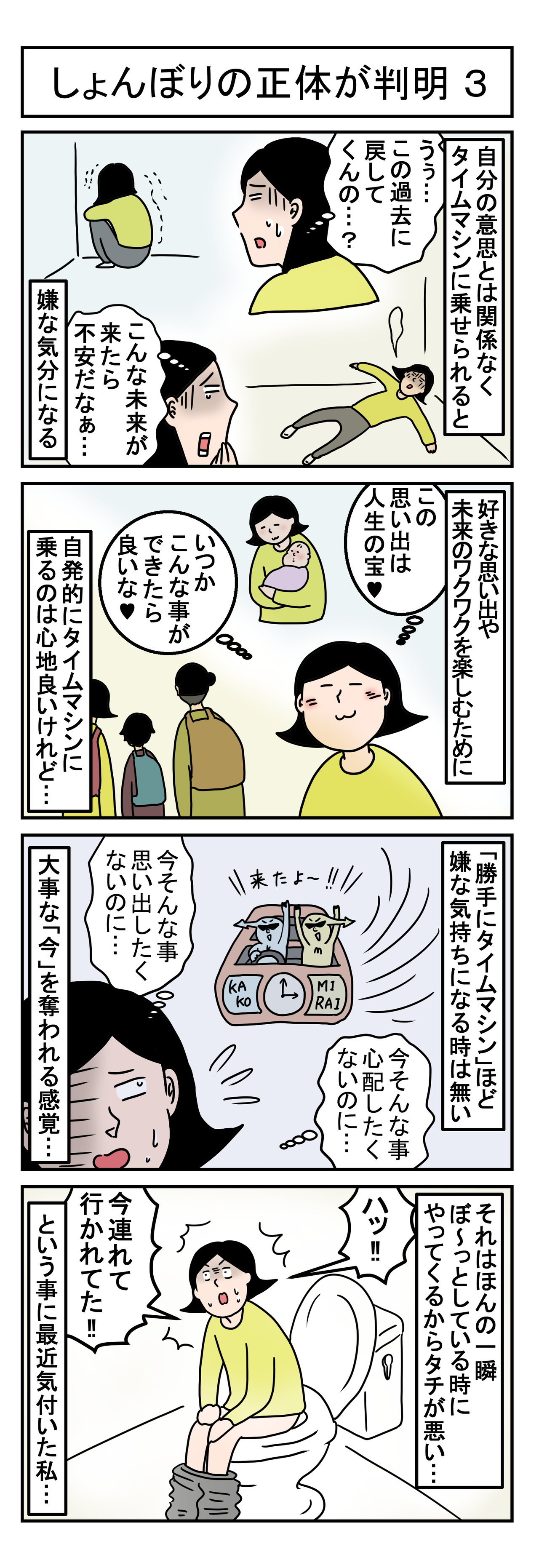 未来のワクワクを楽しむなど、自発的にタイムマシンンに乗るのは心地がいいのに、「勝手にタイムマシン」は、大事な「今」を奪われる感覚になるのだとか。突然、勝手に連れていかれる事に、とてもモヤモヤしてしまうそうです。