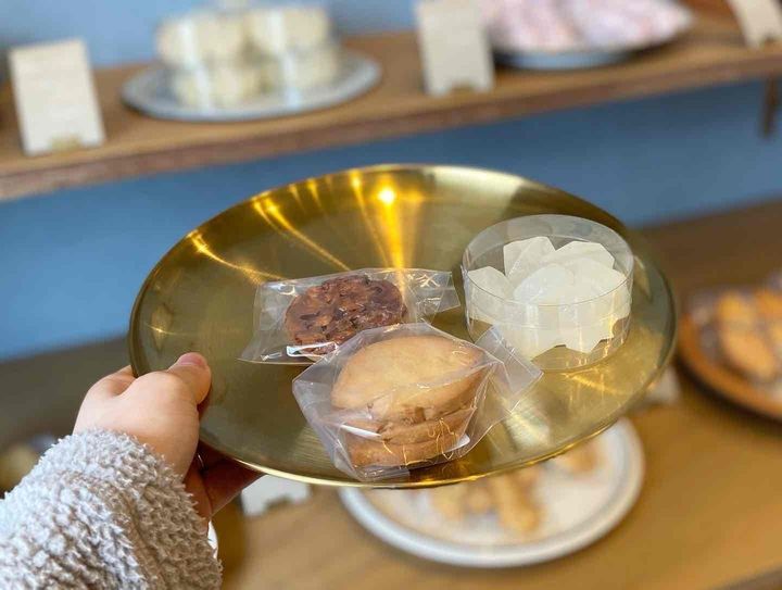 クッキーや琥珀糖などの焼き菓子は、購入したいものをゴールドのトレイに入れるスタイル。さざままな形や色のお菓子たちを選ぶ時間にとてもワクワクしました…!