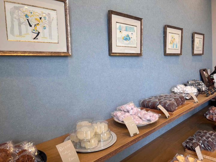 店内はブルーの壁紙が爽やかで、一瞬で菓子屋 ツキノミの優しい世界観に引き込まれます。焼き菓子コーナーの壁面に飾ってあるイラストはイラストレーター「hale」さんによる書き下ろしで、店名の由来になった“ツキノミ”を使ってお菓子ができるまでのストーリーになっています。