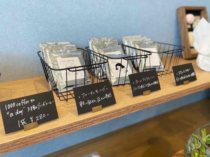 菓子屋 ツキノミでは、富山市内を中心に活動をされている「1000 coffee(センコーヒー)」の、可愛いパッケージのドリップバッグも販売しています。お菓子を差し入れする際などに、一緒にコーヒーのドリップバッグを買っていくと喜ばれそうですね。